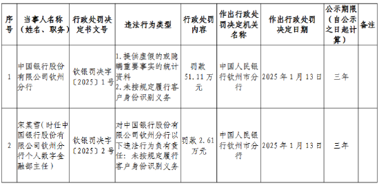 1月15日金融一线讯息,中国东谈主民银行钦州市分行日前公布的行政经管决定信息公示表浮现,中国银行股份有限公司钦州分行因提供诞妄的或隐私紧迫事实的统计贵寓;未按规定实施客户身份识别义务,被罚金51.11万元。